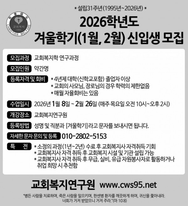 2026학년도 겨울학기 신입생 모집 페이지 정보 작성자 한국교회복지사회 댓글 0건 조회 56회 작성일 25-11-20 18:30 본문 2026학년도 겨울 학기 신입생 모집 *겨울 학기 과목* 성경복지학, 교회복지시설론 목록 댓글목록 댓글목록 등록된 댓글이 없습니다.